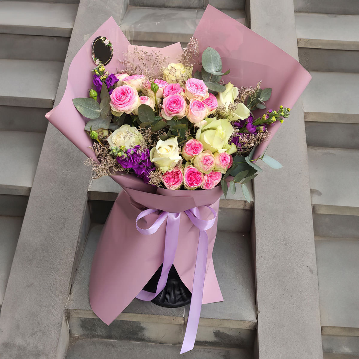 Роза одноголовая чайная, роза пионовидная кустовая розовая, маттиола фиолетовая, эвкалипт, лимониум. Упаковка (лента, пленка, крафт, сетка, пленка матовая)